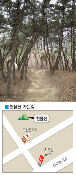 이럴 땐 천을산에 올라가본다. 천을산은 대구 수성구 시지동 고산중학교 바로 뒤편에 있는 야트막한 산이다. 산이라기보다 언덕이라는 표현이 어울릴 정도로 완만한 곡선을 이루고 있는 천을산은 수성구청에서 해맞이 행사를 하면서 널리 알려졌다.