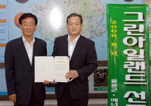 이태용(사진 오른쪽) 경북도 에너지관리공단 이사장과 정윤열 울릉군수는 이날 '그린 아일랜드' 선언문을 발표하고 미래의 에너지 고갈과 세계기후변화에 능동적으로 대처하고, 국가의 저탄소 녹색성장에 앞장서기로 했다. 공단과 울릉군은 울릉도의 에너지사용현황 조사, 에너지 사용 계획 수립 등을 위한 예산확보를 위해 적극 협조키로 했다.