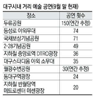 대구시가 추정하는 각종 아마추어 공연 단체와 동호회, 모임 등은 1만여개로, 올 한 해 공원, 동성로, 지하철역 등 대구 시내 주요 거리 무대에서 개최됐거나 개최될 예정인 공연만 500여회에 이른다. 대구 거리 예술 중심지는 단연 공원이다. 5~10월 국채보상공원, 경상감영공원, 2·28 기념공원, 두류공원 등에서 열리는 거리음악회와 런치타임 콘서트만 300여회.