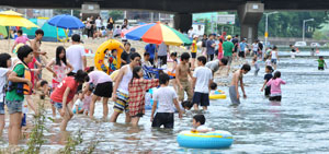 초복을 하루 앞둔 18일 오후 대구 수성구 가창교 아래 신천물놀이장에서 시민들이 더위를 식히고 있다. 이날 대구 낮 최고기온은 32.3℃를 기록하는 등 무더운 날씨를 보였다. 대구기상대 관계자는 19일"오늘 낮 최고기온이 33도까지 오르며 본격적인 불볕더위가 시작된다"고 예보했다.