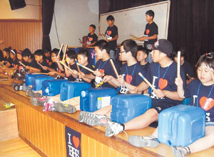 ▲수련대회에 참가한 청소년들이 드럼북 공연을 하며 즐거워하고 있다.
