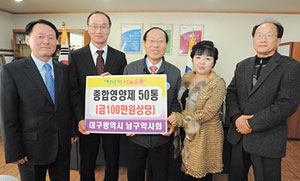 대구광역시 남구약사회(회장 이한길)는 26일 남구청을 찾아 관내 홀몸노인과 조손가정 등 저소득층 50가구에 줄 종합영양제 50통(100만원 상당)을 전달했다.