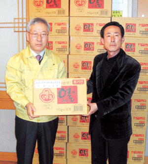 경산시 환경미화원노동조합(위원장 이희점'오른쪽)은 최근 지난해 12월부터 구제역 확산 방지를 위해 총력전을 펼치고 있는 경산시 재난안전대책본부를 방문해 라면 30상자를 위문품으로 전달했다.