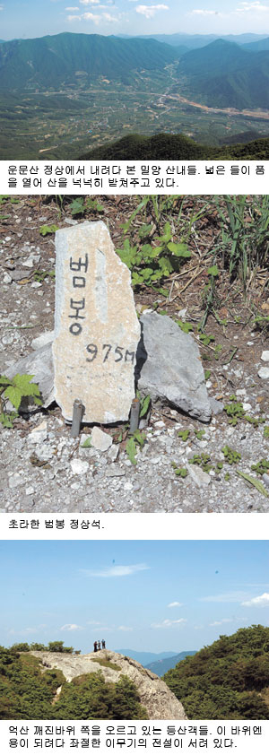 ◆정상에 서면 밀양 산내들 너른 품 한눈에=딱밭재에서 숨을 고른 후 다시 운문산을 향해 올라선다. 오늘 등산의 두 번째 난코스다. 표고 차는 400m에 불과하지만 급경사로 이루어진 탓에 체력소모가 크다.