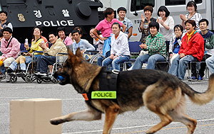 19일 대구지방경찰청 특공대 연병장에서 성보학교 학생들이 폭발물 탐지견의 시범을 보며 신기해하고 있다. 이들은 이날 대구지방경찰청의 초청으로 112신고센터, 교통정보센터, 과학수사계 등 청사를 둘러보며 즐거운 시간을 보냈다.