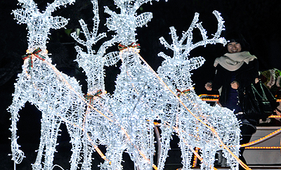 연말 연시가 다가오면서 대구 도심 곳곳에 야간 장식물이 설치돼 밤 거리를 아름답게 수놓고 있다. 4일 밤 국채보상운동기념공원에서 한 시민이 루돌프 썰매를 끄는 포즈를 취하며 즐거워하고 있다.
