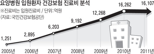 이 때문에 요양병원에 투입되는 건강보험 재정은 엄청나게 늘고 있다. 건보공단이 발표한 '최근 6년간(2005~2010년) 요양병원 입원환자 건강보험 진료비 분석' 자료에 따르면 요양병원 입원진료비는 2005년 1천251억원에서 2010년 1조6천262억원으로 최근 6년 사이 13배나 증가했다. 지난해는 1조6천107억원이었다.