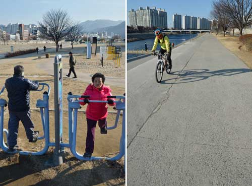 편의시설이나 도로 사정이 좋은 신천 좌안과 시멘트 포장만으로 이뤄진 신천 우안 산책로. 성일권기자 sungig@msnet.co.kr