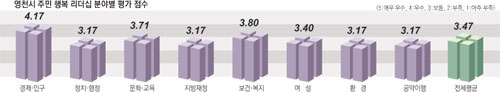 경제'인구 분야에서 좋은 점수를 받았고, 상대적으로 정치'행정, 환경 분야 등에서 낮은 점수를 받았다. 하지만 전체적으로 고른 점수를 얻었다.