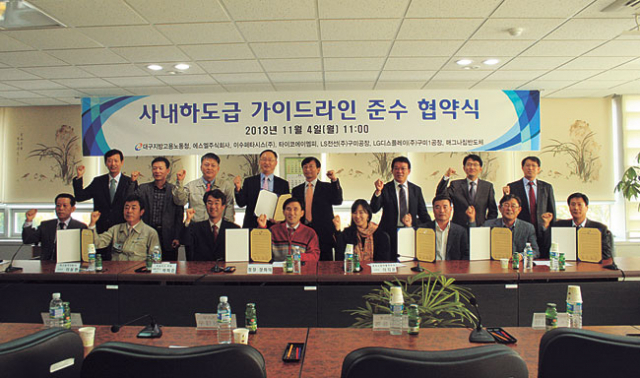 대구지방고용노동청(청장 장화익)은 4일 에스엘주식회사, ㈜이수페타시스, 타이코에이엠피, LS전선㈜ 구미공장, LG디스플레이㈜ 구미1공장, 매그나칩반도체 등 사내 하도급을 활용하는 대기업 원'하청 업체 6곳과 '사내 하도급 근로자의 근로조건 보호 가이드라인' 준수 협약을 체결했다.