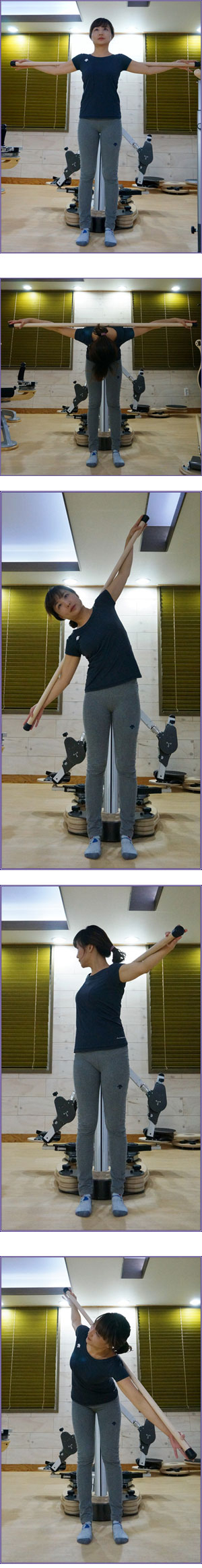 우선 봉을 어깨에 가로로 걸치고 정면을 보고 선다. 다리는 어깨나 골반 넓이로 벌린 상태에서 봉이 어깨에서 들리지 않도록 유지한다. 이 상태에서 몸을 앞으로 숙여 척추가 하나씩 벌어지는 느낌으로 앞으로 숙인다. 이때 엉덩이가 뒤로 나가지 않게 하고 척추 모양이 옆에서 봤을 때 지팡이처럼 구부러지며 정수리가 바닥으로 내려가도록 한다. 내쉬면서 내려갔다가 들이쉬면서 준비자세로 돌아오는 것을 4회 반복한다.