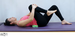 우선 천장을 보고 누운 다음 허리 아래에 타월을 4번 접어서 깐다. 다음으로 고관절이 접히도록 한쪽 무릎을 세워 가슴 쪽으로 당긴다. 이때 꼬리뼈가 바닥에서 떨어지지 않도록 주의한다. 천천히 한 다리씩 각각 4번 반복한다.(사진 1)