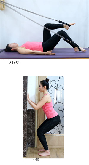 다음으로는 천장이나 높은 곳에 스트링이나 고무줄을 묶어 놓고 한쪽 발에 묶은 다음 그 다리를 바닥으로 천천히 내린다. 이때도 역시 엉덩이가 들리지 않도록 주의하며 한 다리씩 교대로 8번에서 16번 반복한다.(사진 2)