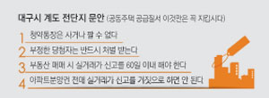 대구시 도시재창조국 관계자들은 지난주 두 차례 긴급회의를 열고 불법 점프 통장의 근절 대책을 마련했다. 향후 분양 단지를 중심으로 견본주택 등에서 집중 단속을 펴고 부정한 당첨자는 반드시 처벌받는다는 내용의 유인물을 배포한다. 부정 청약자로 의심되는 이들에 대한 데이터베이스를 구축해서 이후 국세청과 경찰에 수사를 의뢰한다는 방침도 정했다.
