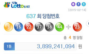 나눔로또는 14일 오후 추첨된 로또복권 제637회 1등 당첨자 배출점이 대구 달성군 논공읍 북리 '복권나라' 등 4곳이라고 밝혔다.