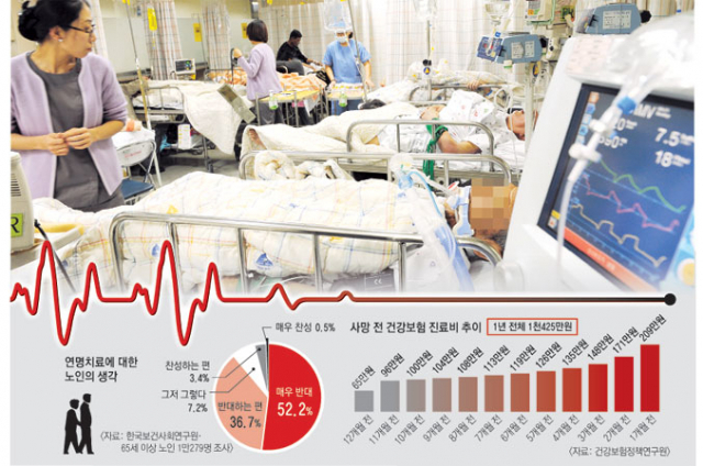 연명치료는 환자와 가족들에게도 큰 경제적 부담이 된다. 장기요양보험 급여 이용자가 사망하기 전 1년 동안 쓴 건강보험 진료비는 1천425만원에 이른다. 입원비가 1천157만원으로 가장 많고, 외래 진료비 118만원, 약국 95만원 등이었다.