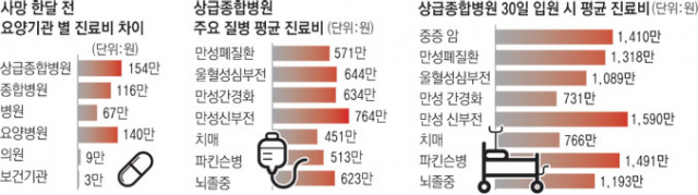 상급종합병원으로 갈수록 부담은 더욱 커진다. 사망 전 한 달간 1인당 평균 급여비는 상급종합병원이 154만원으로 가장 많고, 요양병원 140만원, 종합병원 116만원, 병원 67만원, 의원 9만원, 보건기관 3만원 등의 순이었다.
