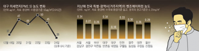 겨울철 미세먼지의 습격이 시작됐다. 이달 20일부터 짙은 농도를 유지하던 대구의 미세먼지가 24일까지 이어졌다. 발암물질까지 포함하고 있는 미세먼지는 각종 질환으로 이어질 우려가 높다. 특히 산으로 둘러싸여 분지인 대구는 대기 순환이 원활하지 않아 미세먼지 위험지대 중 하나다.
