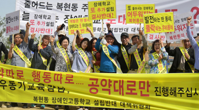 이 때문에 복현동 주민들은 교육청이 주민들과 충분한 협의를 거치지 않고 밀어붙이기 행정으로 학교를 설립하려 한다며 들고 일어난 것이다. 주민 김모(68) 씨는 "주민 모두 이곳에 학교가 들어선다는 사실을 언론을 통해 알았다"며 "장애인 학교 설립에는 충분히 공감하지만 교육감 공약을 바꾸면서까지 추진하는데도 주민들과 한마디 상의 없이 진행하는 것은 말이 안 된다"고 했다.