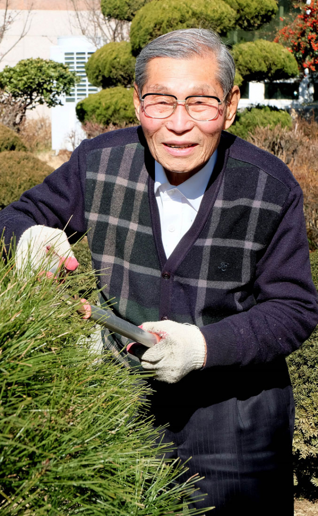 박병립 씨는 맨손으로 천억원대 자산을 일구었지만 자기 것이 아니라며 사회에 환원했다. 매일 아침 학교 교정을 쓸거나 조경 관리도 직접 하고 있다. 박노익 대기자 noik@msnet.co.kr