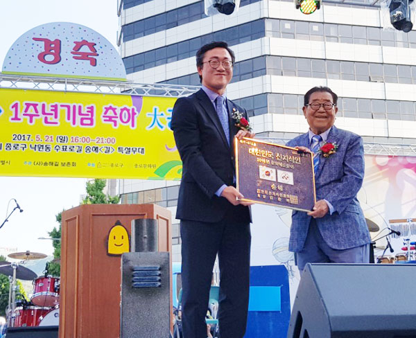 한국신지식인협회중앙회(회장 김종백)는 21일 서울 종로구 송해길에서 열린 '송해길 1주년 기념행사'에서 국민 MC 송해 선생에게 대한민국 신지식인 현판을 전달했다.