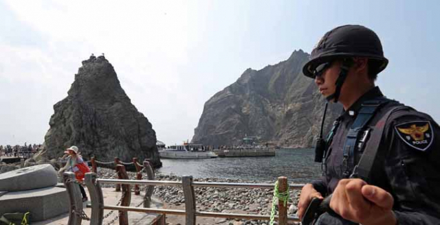 15일 오후 독도에서 우리 경찰이 경계근무를 서고 있다. 해군은 앞서 이날부터 16일까지 독도방어훈련을 실시한다고 밝혔다. 이번 훈련은 문재인 정부 출범 후 첫 독도방어훈련이다. 광개토대왕함 등 해군, 해경 함정 7척과 항공기 등이 투입되며 해병대 상륙훈련도 실시한다. 연합뉴스