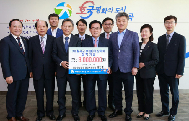 대한건설협회 경상북도회(회장 배인호)는 최근 (재)칠곡군호이장학회(이사장 백선기 칠곡군수)를 방문해 지역 인재육성과 교육발전을 위한 장학금 300만원을 기탁했다.