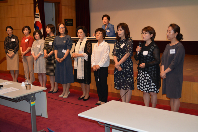 한국여성경제인협회 경북지회 창립총회에서 초대 회장으로 선출된 류병선 영도벨벳 대표를 비롯한 임원과 대의원들이 인사말을 하고 있다. 김진만 기자
