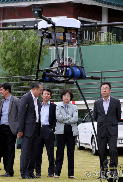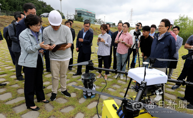 김은경 환경부 장관이 녹조 감시 및 하천 수질 측정용 드론 시연을 지켜보고 있다.