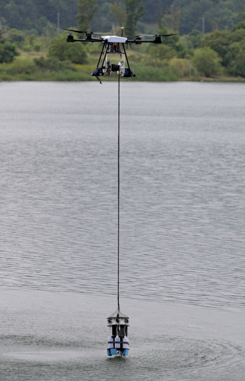 녹조 감시 및 하천 수질 측정용 드론이 낙동강 물을 취수하고 있다.