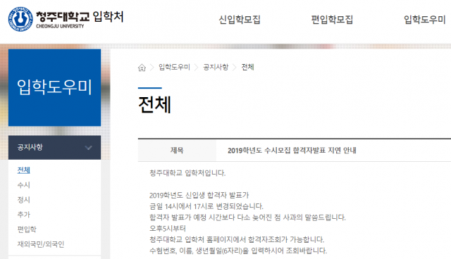 청주대학교 수시 합격자 발표 시각이 당초 6일 오후 2시에서 오후 5시로 변경됐다.