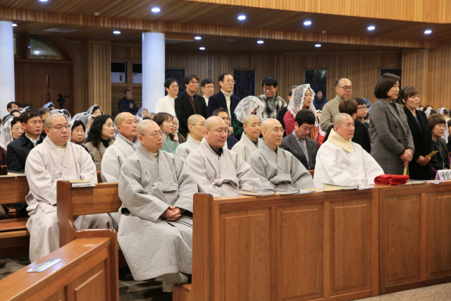 돈관 스님 일행은 2시간가량 진행된 미사 내내 두 손을 모으고 성탄의 기쁨을 함께했다. 또 구유 경배를 하며 아기 예수님을 향해 깊이 인사하기도 했다.