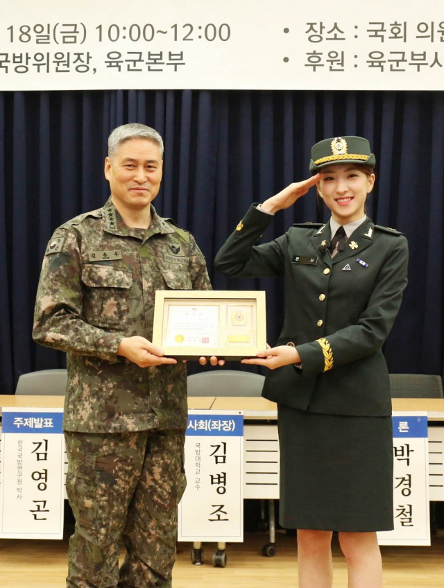 18일 국회 의원회관에서 열린 '국방개혁 2.0과 부사관 역량강화' 세미나에서 김용우 육군참모총장(오른쪽)이 걸그룹 우주소녀 은서에게 육군홍보대사 위촉장을 수여하고 있다. 연합뉴스