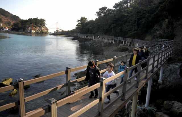 관광객들이 바다위를 걷는 듯한 만지도 해안데크로드길을 걷고 있다. 이채근 기자 mincho@imaeil.com