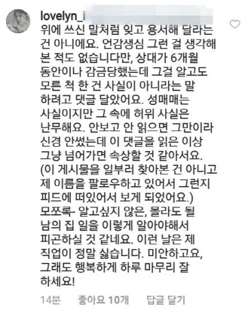 린은 최근 남편 이수의 성매매 전력을 나무라는 한 누리꾼에게 "혐의는 진실이지만 그 속에 거짓 내용이 담겨 있다"고 댓글을 남겼다.