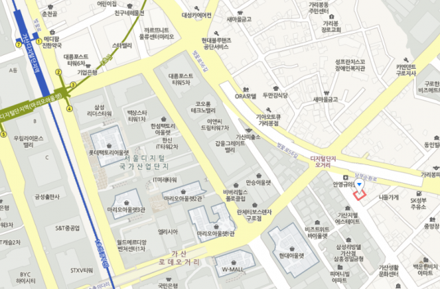 가산디지털단지에 있다. 디지털단지오거리 바로 남쪽에 위치해 있다. 가산로데오거리 동편. 가장 가까운 지하철역은 1호선 및 7호선 가산디지털단지역이다.
