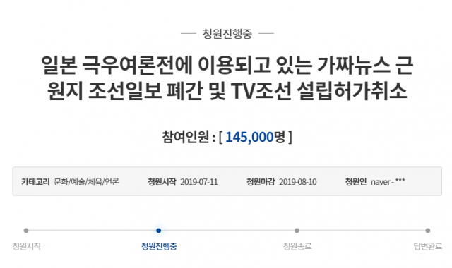 해당 청원글의 정확한 제목은 '일본 극우여론전에 이용되고 있는 가짜뉴스 근원지 조선일보 폐간 및 TV조선 설립허가취소'이다.