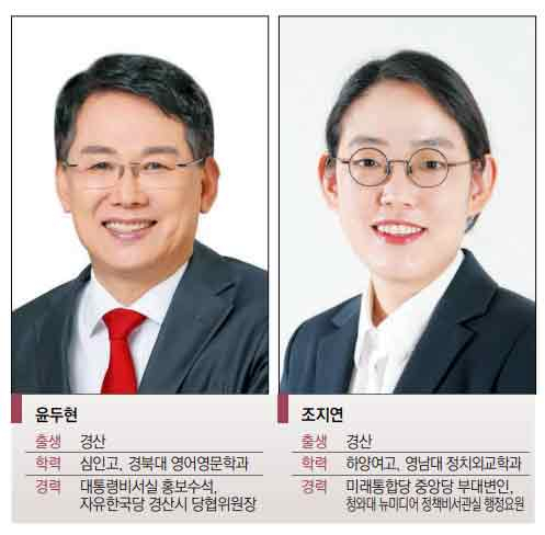 미래통합당 경북 경산시 선거구는 인물론와 화합을 강조하는 윤두현(58), 경산의 변화와 새정치를 내세우는 조지연(33) 예비후보가 공천 티켓을 놓고 치열한 경쟁을 펼치고 있다.