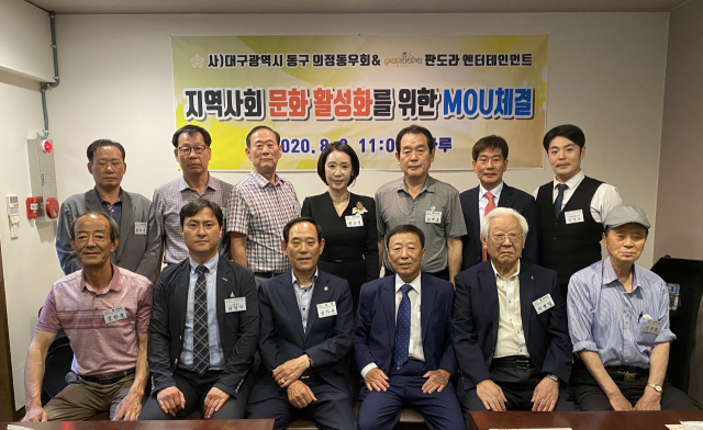 대구 동구 의정동우회(회장 성기수)와 판도라엔터테인먼트(대표 최정익)는 8일 대구 동구의 한 한정식 식당에서 체육과 공연을 결합한 코로나19 극복 힐링 콘서트 등 동구 지역 문화 소외계층을 위한 봉사 공연에 대한 업무협약을 체결했다.