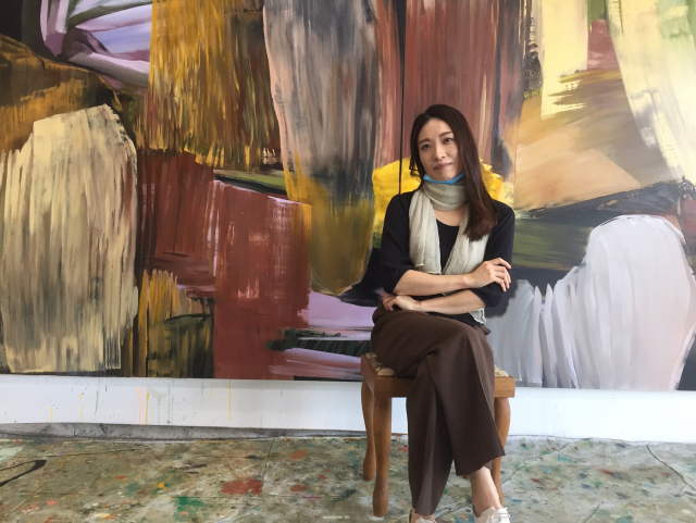 박경아 추상표현주의 화가가 자신의 화실에 걸린 대형작품 앞에서 포즈를 취하고 있다.