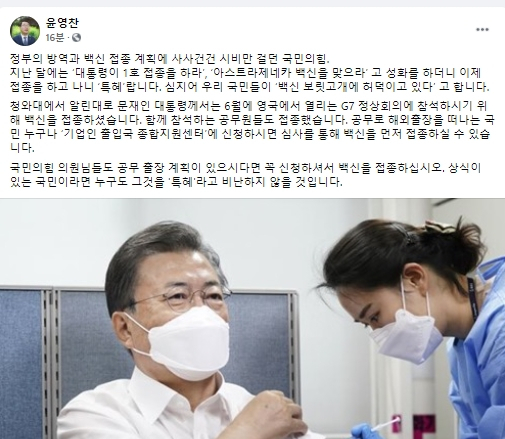 이어 "청와대에서 알린대로 문재인 대통령께서는 6월에 영국에서 열리는 G7 정상회의에 참석하시기 위해 백신을 접종하셨다. 함께 참석하는 공무원들도 접종했다"며 "공무로 해외출장을 떠나는 국민 누구나 '기업인 출입국 종합지원센터'에 신청하시면 심사를 통해 백신을 먼저 접종하실 수 있다"고 설명했다.