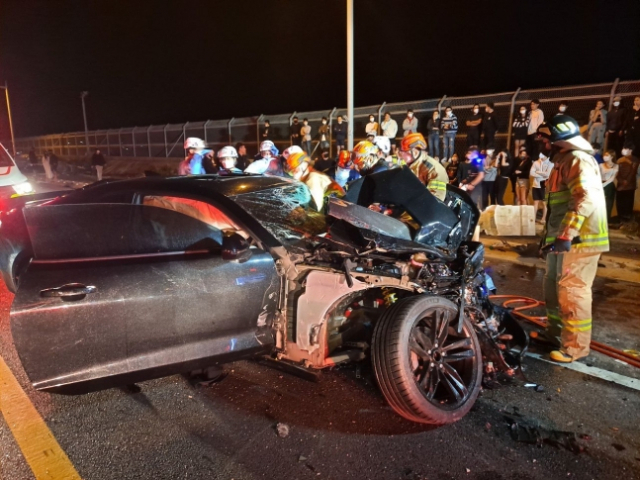 이날 경찰에 따르면 인천시 중구 용유동 영종해안북로 편도 2차로 도로에서 서울 방향으로 가던 스포츠카 '쉐보레 카마로'가 앞서 달리던 '현대자동차 아반떼' 승용차를 추돌했고, 이어 카마로는 중앙선을 넘어 마주 오던 '기아 모닝' 경차와 다시 충돌했다.