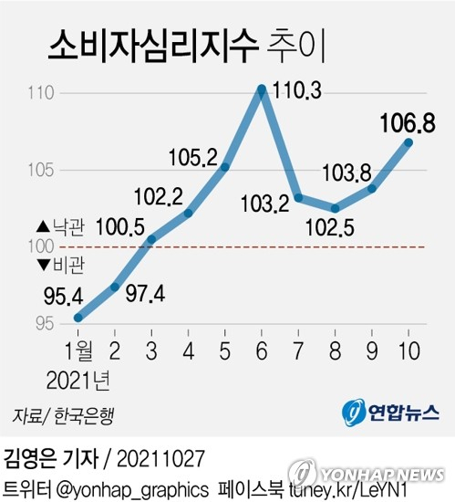 [그래픽] 소비자심리지수 추이 (서울=연합뉴스) 김영은 기자 = 한국은행이 27일 발표한 \'소비자동향조사\' 결과에 따르면 10월 소비자심리지수(CCSI)는 106.8로, 지난달보다 3포인트(p) 상승했다. 0eun@yna.co.kr 트위터 @yonhap_graphics 페이스북 tuney.kr/LeYN1 (끝)