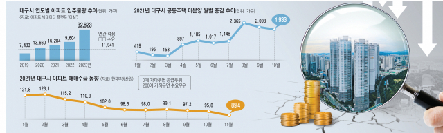 지난 10월 말 기준 대구 아파트 미분양은 1천933가구로 아직 위험한 수치는 아니지만, 대규모 청약 미달 사태와 입주 폭탄이 맞물릴 경우 한순간에 급증할 수 있다는 우려가 커지고 있다.