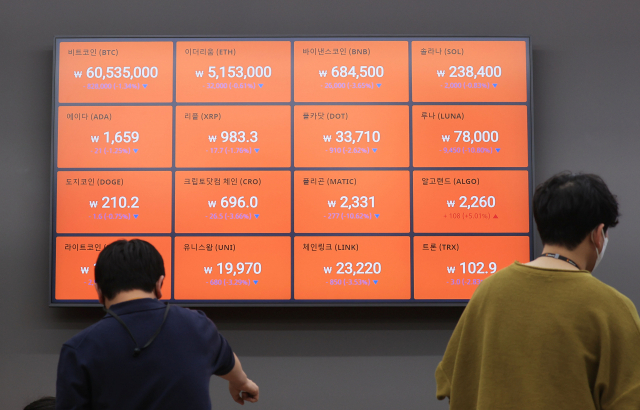 지난 12월 6일 오후 서울 서초구 빗썸 고객지원센터 전광판에 암호화폐 시세가 표시되고 있다. 연합뉴스