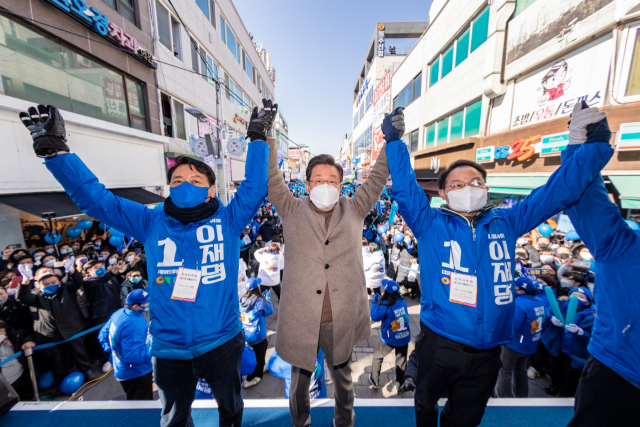 더불어민주당 이재명 대선 후보가 24일 강원도 원주시 중앙로 문화의 거리에서 열린 '강원도 코리아 프리미엄 시대, 이재명이 열겠습니다!' 원주 유세에서 지지자에게 인사하고 있다. 연합뉴스