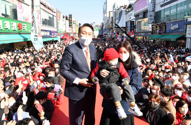 국민의힘 윤석열 대선 후보가 24일 오후 경기도 수원시 팔달문 앞에서 집중유세를 하고 있다. 연합뉴스