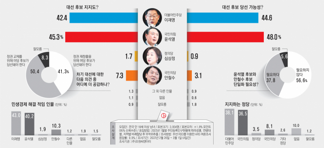 포스트 코로나19 시대 민생경제 현안 해결을 맡길 지도자 관련 질문에는 이 후보(43.0%)가 윤 후보(40.2%)를 오차범위 내에서 2.8%p차로 앞섰다. 안 후보는 10.3%, 심 후보는 1.9%, 다른 인물 1.2%, 부동층은 3.4%였다.