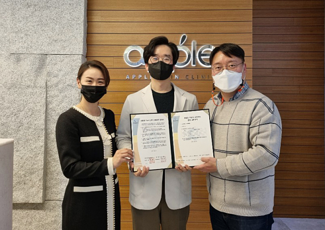 대구 애플피부과에서 정홍대 애플피부과 대표원장(가운데), 영진전문대 뷰티융합과 홍정아(왼쪽) 교수, 배기완 교수가 기념촬영을 하는 모습. 영진전문대 제공