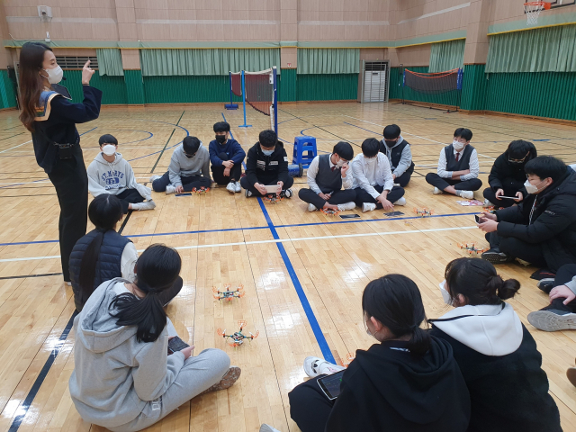 대구시교육청은 '2022. 인공지능(AI) 교육 선도학교' 49곳을 선정했다고 23일 밝혔다. 대구 대곡고 학생들이 드론을 통한 AI 교육 선도학교 수업을 듣고 있다. 대구시교육청 제공